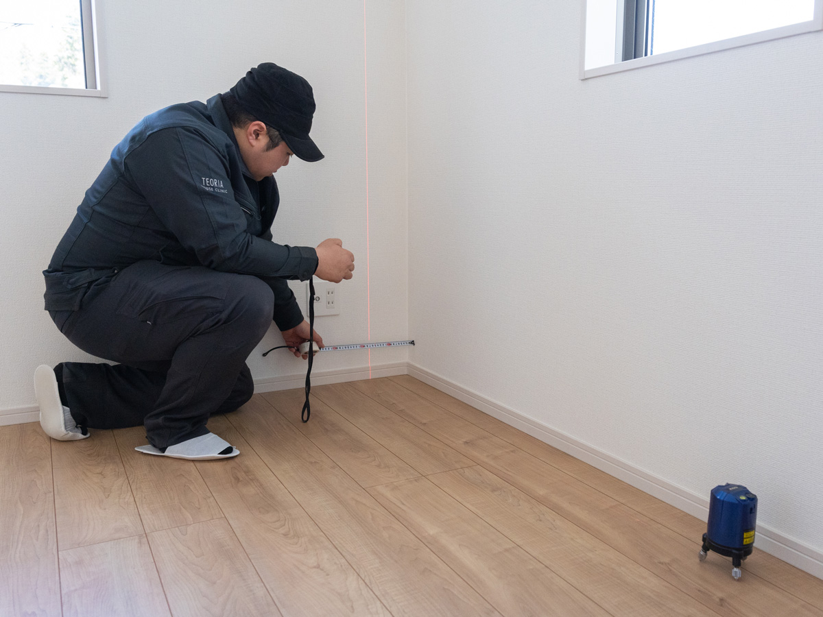 レーザーレベルやデジタル傾斜計を用い、各室の複数ポイントの高さ・傾斜を測って傾きの度合いを確認しています。